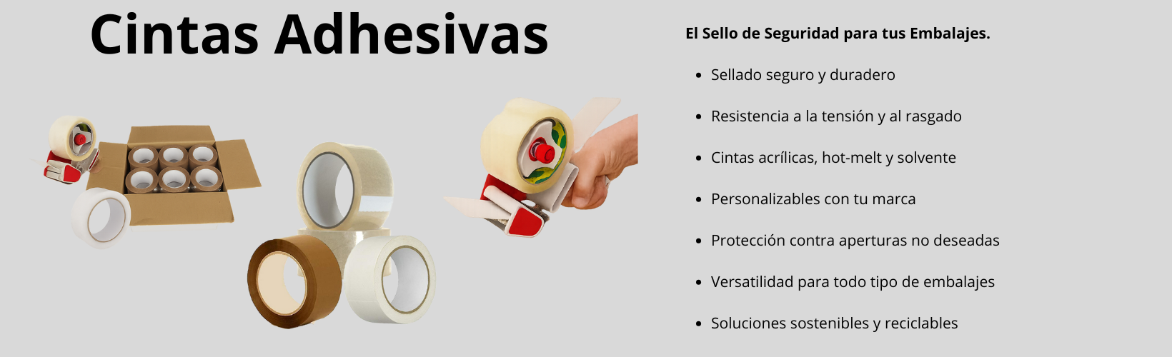 Sellado seguro y duradero / Resistencia a la tensión y al rasgado / Cintas acrílicas, hot-melt y solvente / Personalizables con tu marca / Protección contra aperturas no deseadas / Versatilidad para todo tipo de embalajes / Soluciones sostenibles y reciclables.