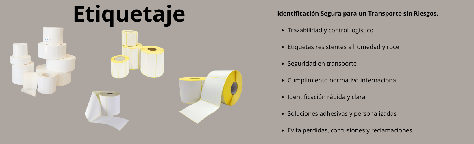 Trazabilidad y control logístico / Etiquetas resistentes a humedad y roce / Seguridad en transporte / Cumplimiento normativo internacional / Identificación rápida y clara / Soluciones adhesivas y personalizadas / Evita pérdidas, confusiones y reclamaciones.